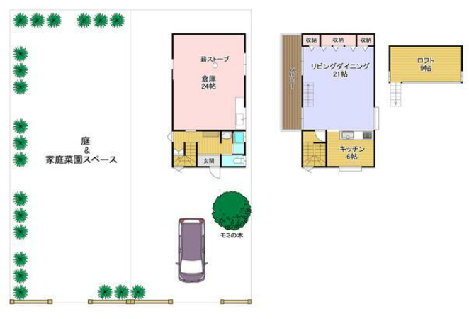 | 美山の自然と無垢の温もりに包まれる、24帖の広々とした倉庫は、アウトドア用品やバイクの収納、アトリエや趣味の工房など、多彩な使い方が可能。大きなモミの木が象徴的に立つ、132坪の敷地。ゆとりある敷地には家庭菜園スペースもあり、自ら育てた野菜や花で季節を感じる暮らしが楽しめます。ヒノキの柱など構造材はすべて無垢材で建てられた別荘です。 |